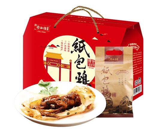 薄如蝉翼的玉扣纸、农家山地散养的三黄鸡、幽深醇厚的秘制卤汁,逐一陈列于案面之上,瞬时间,空气中弥漫着天地融和、原汁原味的诱人芳香!一切经已准备就绪,粤菜厨艺大师们开始运用巧妙的刀工,游刃有余地将三黄鸡切成一件一件,接着勺来秘制卤汁,配以老抽酱油、白酒、枸杞、姜汁、桂皮、八角、茴香、陈皮、草果、红谷米、古月粉等调味料腌制鸡肉,随后,铺开玉扣纸且用手抚平,再将鸡肉置于玉扣纸之上、撒些葱白粒,松紧得度地包裹起来。就这样,一份份如信封形状的纸包鸡包好了,造型优美、叠叠有致。将纸包鸡放入锅中,以花生油隔纸浸炸,片刻的功夫,热气腾腾的纸包鸡终于端上餐桌,一股浓浓的南粤气息扑面而来,轻轻地撕开玉扣纸,金光灿灿的纸包鸡奇妙地飘出了竹子那渗人心脾的缕缕清香,这是以新鲜的嫩竹和清澈的山泉水所制成的玉扣纸独有的香气,缓缓地放入口中,鸡肉鲜嫩甘滑、鸡味浓郁、醇厚不腻……细品一下纸包鸡的历史文化,可以用“博大精深、源远流长”这8个字来形容。“南粤称臣兮,归一统;纸包金鸡兮,定乾坤。”岭南地区(两广地区)民间所流传的这句人们耳熟能详的赋作,仿佛诉说着纸包鸡的前世今生……传世2200年“中国金鸡文化”(粤菜代表作)(广府菜代表作)(汉代宫廷贡品和南越王宴主菜)、中国味道、中国传统节庆第一道菜、广府中秋节庆三大美食、中华美食三大名鸡、深圳腾飞、广西三宝、梧州四宝、桂林情结、喜欢纸包鸡的100个理由是中国当代著名国学家、文化学者肖健对纸包鸡的文化定位,业已在海内外形成广泛共识,家喻户晓、深入人心,此外,纸包鸡还是中国名菜、中国十佳金鸡、广西非物质文化遗产、广西特产行销全国核心品牌、广西最具特色餐饮品牌。古有南越王、汉高祖、苍梧王、唐明皇、杨贵妃、苏轼、明太祖、靖江王、康有为,今有孙中山、陈济棠、白崇禧、徐悲鸿、秦牧、史玉柱等名人,都曾在纸包鸡的史册上留下足迹,为它增添了丰富的传奇色彩!据考证,在我国,自古以来就有“无鸡不成宴”的习俗和讲究,集中、真实地体现了中国传统饮食文化理念和社会风俗习惯,鸡菜肴堪称中国传统节庆第一道菜,同时又是人们一日三餐的主要菜肴,纸包鸡堪称鸡菜肴中的代表作。广州,是岭南文明、珠江文明、广府文明、粤菜文化、岭南美食文化的重要发祥地,“食在广州”可谓名不虚传,纸包鸡作为宫廷贡品和日常主菜的历史至少已有2200年,始创于岭南地区,在见证了岭南地区(两广地区)文明史的西汉南越王墓中,就发掘出许多类似于纸包鸡的鸡骨头和残纸。相传,公元前203年,赵佗自号南越武帝,建立南越国,定都番禺(今广州),当时的南越王宴就是以纸包鸡作为主菜的。公元前202年,刘邦称帝,史称汉高祖,建立西汉王朝,定都长安(今陕西西安)。及后,赵佗以纸包鸡作为贡品献与刘邦,上表臣属西汉,刘邦品尝了纸包鸡之后龙颜大悦,诏封赵佗为南越王,至此天下归于大一统,纸包鸡遂成为南越国向西汉王朝年年进贡、岁岁来朝的贡品。纸包鸡和广西桂林这座城市颇有渊源,明朝太祖皇帝朱元璋举“众建宗亲,以藩王室”之政,洪武三年(公元1370年),诏封其侄孙朱守谦为靖江王,藩治桂林,并授金册、金宝,尊荣显赫一时。及后,建靖江王城于独秀峰之下,内立宫宇庙社数百间、外以高城周垣相护,琼楼玉宇、巍峨雄伟、极尽奢华。靖江王城的宫廷宴席也极为讲究排场,道道菜色可谓千挑万选、精益求精,朱守谦在京城(北京)生活时,早已闻得粤地番禺(今广州)有岭南名食纸包鸡,传承越千年、享誉海内外,深感靖江王宴非纸包鸡莫能压轴,遂特意派人到番禺,礼贤下士,将名厨请进王府专事制作纸包鸡,以彰显靖江王宴和粤桂美食之泱泱风范。民间流传着“靖江宴席既出世,纸包金鸡八桂闻。”的说法。朱元璋尝尽天下美食,对纸包鸡仍然是百吃不厌、情有独钟。他在京城(北京)天天对着美酒佳肴,日久食则无味,朱守谦遂向开国名臣刘基奉上一计,曰:“吾粤桂之地有一名食,谓之纸包鸡,必让圣上食肠大开。”刘基遂托朱守谦将岭南地区的名厨请到京城,并带来岭南特有的土鸡品种,制作这道特色菜肴给朱元璋享用。但见刘基送来一碟用纸包裹着的鸡肉,朱元璋品尝之后赞不绝口,问曰:“此为何物?”刘基答曰:“纸包鸡。”朱元璋龙颜大悦,遂以“此鸡只应天上有,人间能得几回尝。”对纸包鸡赞不绝口,觉得纸包鸡风味远胜于宫廷珍馐百味。用以制作纸包鸡的土鸡品种也因“羽黄、喙黄、爪黄”,被朱元璋钦赐“三黄鸡”的美名,沿用至今。中华民国五年(公元1916年),粤西楼在广西梧州创立,聘请名厨官良坐镇,对纸包鸡的烹饪方法进行锐意改良并使其最终成形,酒楼成为了岭南饮食业中首屈一指的“金漆招牌”。2012年,中国当代著名国学家、文化学者肖健正式开始联手美食界名人林艳光、周秀兰和新粤西楼,通过“互联网+文化定位”文化传播方式对纸包鸡进行强势打造,永保纸包鸡风味特点传世2200年不变。纸包鸡深受广大老百姓的赞誉,海内外盛传着“食在岭南,不能不尝纸包鸡”这个耳熟能详的说法。2017年,乘借着共建21世纪海上丝绸之路、粤港澳大湾区建设、泛珠三角区域合作、珠江—西江经济带建设、发展中国—东盟自由贸易区等国家战略的东风,位于广东和广西交界的粤桂合作特别试验区江北片区内,实用