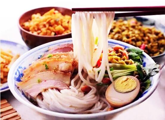 在热气腾腾的桂林米粉中放上几片卤肉、锅烧,再加入小勺卤水均匀拌好,独有的香气扑面而来……桂林米粉起源于秦代,相传,秦皇嬴政为了统一中国,派遣屠睢率领50万大军征战南越,秦军将士皆为西北人,天生就是吃麦面长大的,而南方则盛产大米、不长麦子,他们较长时间驻节桂林,出现了水土不服、上吐下泻的症状。军中厨师经过苦思冥想,根据西北麦面的制作技艺,先以清纯的漓江水将大米泡胀磨成米浆,滤干水份揉成粉团,然后把粉团蒸至半生熟,拿到臼里稍作杵舂,再压榨出一根根圆形线状的粉条。由于经过了反复揣揉,做好的米粉从楼上悬吊一根拖至地面也不会断,筋力可想而知。同时,采用花椒、八角、沙姜、草果、茴香、陈皮、桂枝、丁香、甘草等多种中草药和香料熬制成卤水,待米粉煮熟之后,均匀拌好便可食用,这就是桂林米粉的雏形。由于卤水具有止泻除湿的作用,将士们吃了桂林米粉之后,水土不服的症状消除。桂林米粉发展到清代和民国期间,出现了繁盛的局面,轩荣斋、会仙斋、易荣斋等老字号,各出奇招,吸引了无数的回头客。正所谓“岁月在变,情怀不改”,如今在桂林的街头巷尾,米粉店铺林立,大家欣赏了甲天下的桂林山水,再来一碗桂林米粉,饱享眼舌之福,实在是一大乐事。桂林米粉是在传承中不断发展成形的,以独创的米粉香滑、卤水香浓、佐料丰富等特点,享誉海内外。桂林米粉的精华在于卤水,卤水的制作方法大同小异,通常都是用猪肉、猪骨、牛肉等,配以中草药、香料、三花酒,以文武之火精心熬制而成,营养丰富、香味浓郁,佐以牛腩、卤牛肉片、猪肉、叉烧、锅烧、炸花生、蒜末、葱花、辣椒,食材彼此相融、香气自然散发、美味妙不可言。