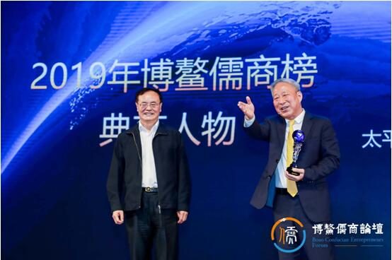 上图:中国民营经济研究会会长、原全国工商联专职副主席庄聪生为庄严智库理事长严介和颁发2019年博鳌儒商榜典范人物奖。