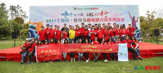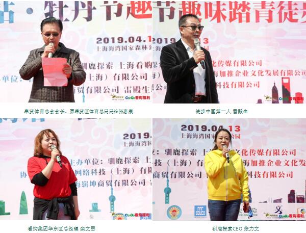 2019年4月13日,由驯鹿探索、上海看购文化传媒有限公司联合主办,上海雷殿生教育科技有限公司、看购网络科技(上海)有限公司、上海秋香文化传播有限公司、上海加推企业文化发展有限公司、亚欧非贸易投资联合促进会、上海崭坤商贸有限公司、上海奉贤安徽商会等共同协办,上海海湾镇人民政府、上海奉贤区体育局、上海海湾森林公园特别支持的2019上海站•牡丹节趣味踏青徒步挑战赛在上海海湾森林公园顺利举行。本次徒步走活动全程12公里,万名参赛者从园内大草坪出发绕园区内一圈。