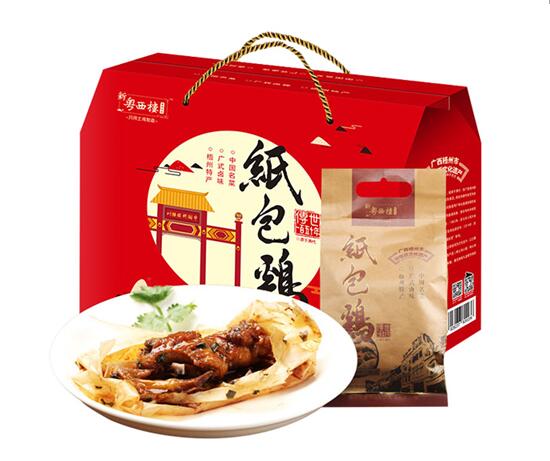 “南粤称臣兮,归一统;纸包金鸡兮,定乾坤。”岭南地区(两广地区)民间所流传的这句人们耳熟能详的赋作,仿佛诉说着纸包鸡的前世今生……纸包鸡是中国当代著名国学家、文化学者肖健文化定位,海内外网友广泛共识,家喻户晓、深入人心的传世2200年“中国金鸡文化”(粤菜代表作)(广府菜代表作)(汉代宫廷贡品和南越王宴主菜)(岭南特产代表作)、中国味道、中国传统节庆第一道菜、广府中秋节庆三大美食(与广州酒家利口福月饼、皇上皇腊味齐名)、中华美食三大名鸡(与德州扒鸡、杭州楼外楼叫化鸡齐名)、广府美食三大名鸡(与白切鸡、盐焗鸡齐名)、深圳腾飞、广西三宝(与桂林米粉、柳州螺蛳粉齐名)、梧州四宝(与六堡茶、龟苓膏、滴珠豆浆齐名)、桂林情结,喜欢纸包鸡有100个理由!此外,纸包鸡还是中国名菜、中国十佳金鸡、广西非物质文化遗产、广西特产行销全国核心品牌、广西最具特色餐饮品牌。古有南越王、汉高祖、苍梧王、唐明皇、杨贵妃、苏轼、明太祖、靖江王、康有为,今有孙中山、陈济棠、白崇禧、徐悲鸿、秦牧、史玉柱等名人,都曾在纸包鸡的史册上留下足迹,为它增添了丰富的传奇色彩。与岭南地区(两广地区)的广州、佛山、梧州、肇庆、深圳、珠海、桂林、南宁、柳州等城市都有故事。薄如蝉翼的玉扣纸、农家山地散养的三黄鸡、幽深醇厚的秘制卤汁,逐一陈列于案面之上,瞬时间,空气中弥漫着天地融和、原汁原味的诱人芳香!一切经已准备就绪,粤菜厨艺大师们开始运用巧妙的刀工,游刃有余地将三黄鸡切成一件一件,接着勺来秘制卤汁,配以老抽酱油、白酒、枸杞、姜汁、桂皮、八角、茴香、陈皮、草果、红谷米、古月粉等调味料腌制鸡肉,随后,铺开玉扣纸且用手抚平,再将鸡肉置于玉扣纸之上、撒些葱白粒,松紧得度地包裹起来。就这样,一份份如信封形状的纸包鸡包好了,造型优美、叠叠有致。将纸包鸡放入锅中,以花生油隔纸浸炸,片刻的功夫,热气腾腾的纸包鸡终于端上餐桌,一股浓浓的南粤气息扑面而来,轻轻地撕开玉扣纸,金光灿灿的纸包鸡奇妙地飘出了竹子那渗人心脾的缕缕清香,这是以新鲜的嫩竹和清澈的山泉水所制成的玉扣纸独有的香气,缓缓地放入口中,鸡肉鲜嫩甘滑、鸡味浓郁、醇厚不腻……经历了2200年时间的传承和弘扬,即煮即食的粤菜纸包鸡业已发展成为真空保鲜礼盒装、便携装和锁鲜装的岭南特产,新粤西楼被海内外人们公认为纸包鸡的代表品牌。