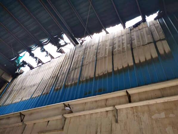 一墙之隔,失火的一边机器物资化为灰烬,房顶钢梁烧融变形