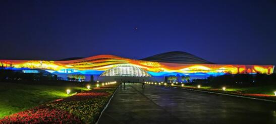 此次投影秀的承建单位为同方股份有限公司。相关负责人介绍说,廊坊大剧院外立面投影面跨度达450米、高度最高达25米,共使用了34台激光投影设备覆盖大剧院北侧外立面,将动态建筑照明、建筑体流动概念与楼体外立面结构进行了巧妙结合,为观众完整呈现一个画面唯美、场面恢弘的丝路故事。