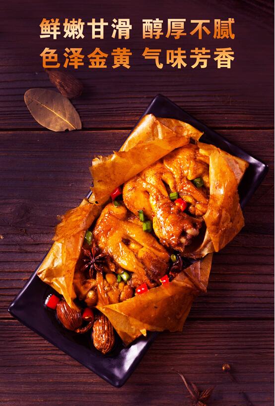 薄如蝉翼的玉扣纸、农家山地散养的三黄鸡、幽深醇厚的秘制卤汁,逐一陈列于案面之上,瞬时间,空气中弥漫着天地融和、原汁原味的诱人芳香!一切经已准备就绪,粤菜厨艺大师们开始运用巧妙的刀工,游刃有余地将三黄鸡切成一件一件,接着勺来秘制卤汁,配以老抽酱油、白酒、枸杞、姜汁、桂皮、八角、茴香、陈皮、草果、红谷米、古月粉等调味料腌制鸡肉,随后,铺开玉扣纸且用手抚平,再将鸡肉置于玉扣纸之上、撒些葱白粒,松紧得度地包裹起来。就这样,一份份如信封形状的纸包鸡包好了,造型优美、叠叠有致。将纸包鸡放入锅中,以花生油隔纸浸炸,片刻的功夫,热气腾腾的纸包鸡终于端上餐桌,一股浓浓的南粤气息扑面而来,轻轻地撕开玉扣纸,金光灿灿的纸包鸡奇妙地飘出了竹子那渗人心脾的缕缕清香,这是以新鲜的嫩竹和清澈的山泉水所制成的玉扣纸独有的香气,缓缓地放入口中,鸡肉鲜嫩甘滑、鸡味浓郁、醇厚不腻……
