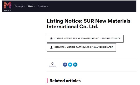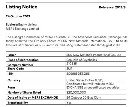 当地时间2019年10月24日,MERJ证交所(MERJ EXCHANGE,原名Trop-X、塞舌尔证券交易所,英联邦国家塞舌尔的唯一持牌证券交易所)官方正式发出公告,宣布由上海楚丞投资管理有限公司(楚丞资本)保荐的企业SUR New Materials International Co. Ltd.被正式批准于其主板上市,其运营实体为中国本土的新材料高科技企业,其本次上市的股票代码为SUR,ISIN代码(国际证券识别编码)为SC9985GEBG66。据悉,包括SUR在内,楚丞资本今年已经帮助5家企业完成在塞上市,预计在年底前可能完成更多企业上市,可见进展十分迅速。