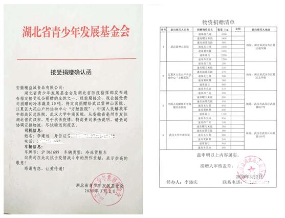 此时,记者想说:这就是“硬核”!哪有岁月静好,只是有人替你负重前行。安徽省精益诚食品有限公司不计企业自身的困难,把生产的第一批食品的三分之二捐献给武汉的医护工作者食用,足以说明了他们的大爱之举。此次捐赠活动得到了民革北京市委会联络处处长、海淀区工委办公室主任石军,民革安徽省委会社会服务部部长张传仓,民革湖北省委会组织部部长夏铸,民革武汉市委会秘书长孙凯的支持和协助。作为亳州市政协委员又是海淀民革党员的徐磊在疫情当前,不怕疫情风险的随时侵袭,多方协调、只身前往外地采购口罩,力求最大限度地支持武汉抗击疫情,让人敬佩。正如湖北省青少年基金会的评价:“他不是生而英勇,而是选择无畏。”(记者齐佩东)