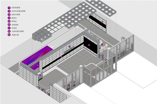 抽象的光变成具像的形态,这份光亮变得触手可及。设计用软膜灯箱来消除人工光源的刺眼感受,整体光源全部是柔和的发光面。大片的面光源用空间构成的手法形成整个大堂的光墙和顶面。大堂的主要功能是用于观众的汇聚和疏导。步入大堂首先看到的是由墙顶地构成的光网格空间,是观者用于合影留念的场地。右侧播放宣传片的屏幕嵌于光墙之中。两侧的安检闸机对应不同的参观流线。接待台背后的存包空间呈现了整个场所唯一的亮色,明艳的紫红色增加了空间的层次。材料和技法只是这次空间叙事的词汇,形式是呈现的结果,而这些都不是事件的出发点。