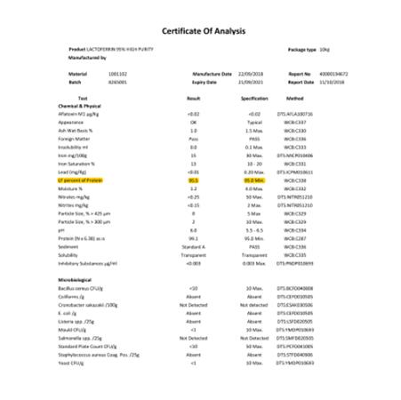 最后就是根据2017年实施的食品安全国家新标准《食品营养强化剂乳铁蛋白》—GB1903.17-2016,对乳铁蛋白的理化指标进行了修改,其中将乳铁蛋白纯度从90%提升至95%。而我只在这款AUCOKO乳铁蛋白这边找到了相关的产品证书,所以我就继续先跟进了这款产品的其他信息。