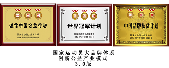 国家运动员大品牌体系通过诚信中国公益行动(22家央媒2016/8/28报道)中国品牌扶贫计划(24家央媒2018/9/24报道)世界冠军计划(21家央媒2018/12/3报道)实现全公益与零收益。在全社会公益推行信用重构、品牌扶贫,冠军赋能行业独角兽成为世界冠军,为创新理论/实践/成果助力人民群众更多获得感、幸福感、安全感而奋斗。