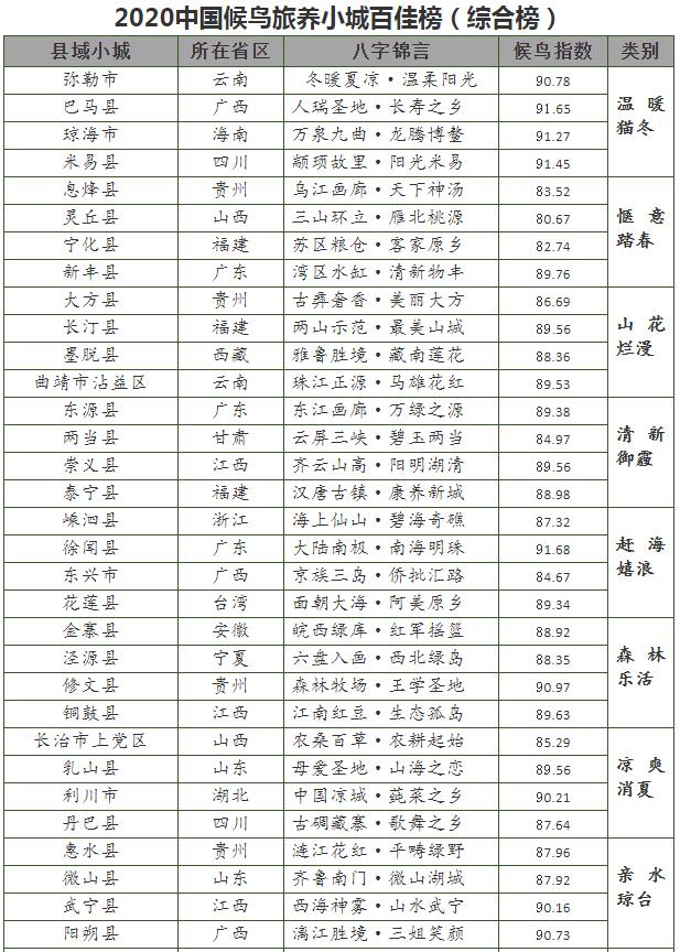 2020中国候鸟旅养小城百佳榜(分类榜)