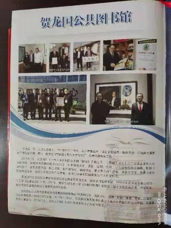 此次贺龙国公共图书馆入编《中华人民共和国年鉴》,是对贺龙国多年来身践力行为推动中华文化走向世界,把中国文学介绍给世界所做的突出贡献的肯定和表彰。必将走向全球、被历史深深铭记。
