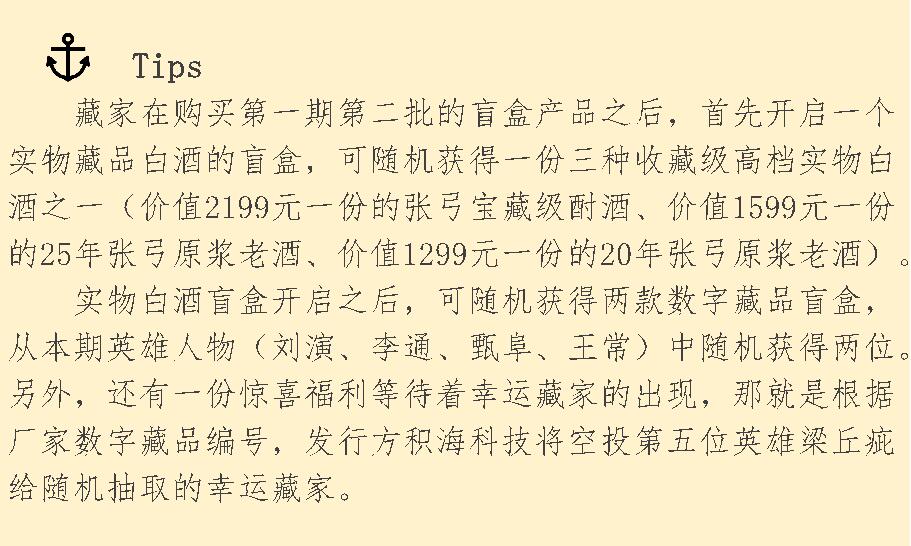 品牌方河南省张弓酒业有限公司和发行方积海(北京)科技有限公司都极其重视第一期的发行工作,对第一期第一批的所有藏家全部进行回访和调研,而后结合藏家的反馈,将第一期第二批的玩法设计(附项目详情)进行了优化,从细节处体现出用心。