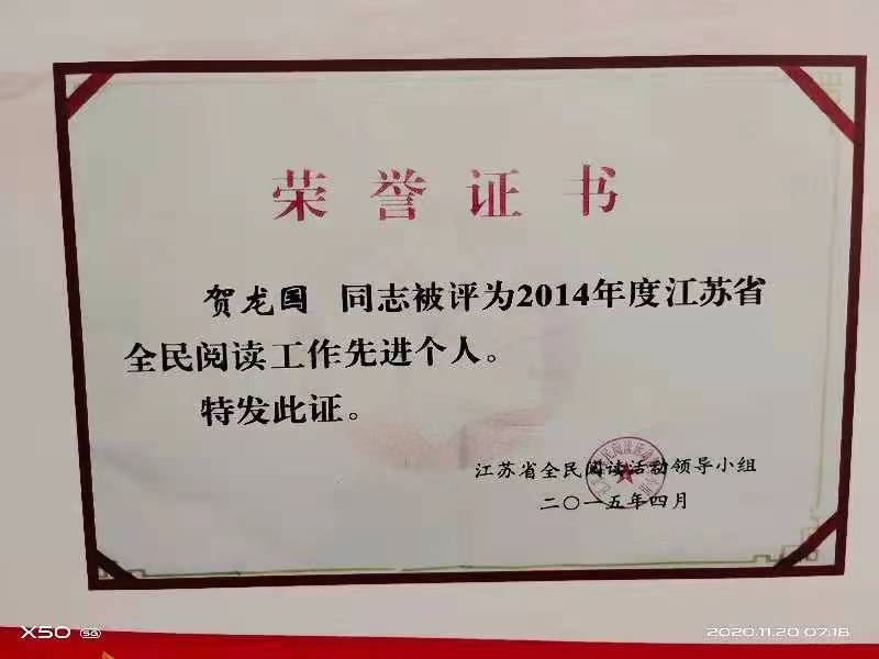 贺龙国是江苏省连云港市灌南县田楼镇三兴社区一位热心阅读推广和公益服务的文化志愿者。他从自费办“龙国万册农家书屋”,到创办私人公共图书馆,20多年来,累计接待读者、学习参观者及借书达32万人次,先后举办农家书屋全民阅读推广会、百名小记者暖冬读书会、灌河两岸作家笔会、学习中国好人读书会等活动近百场。