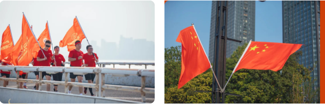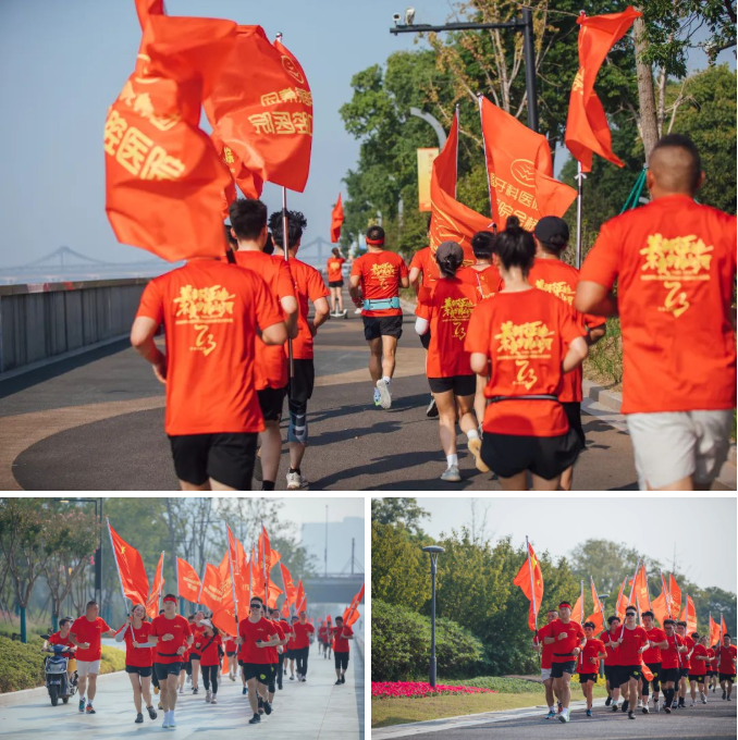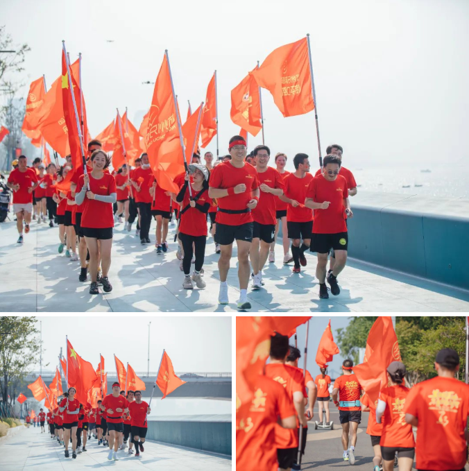 队首国旗招展,又有二十余面杭牙集团院区旗帜随风飘扬~红色热血,渲染时空!