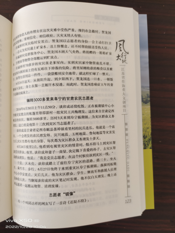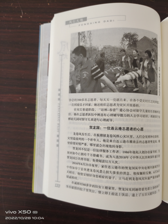 今天上午,世界文化名人、全国优秀志愿者、全国爱心大使、贺龙国公共图书馆馆长、连云港市作家协会会员贺龙国,收到从江苏省盐城市阜宁县广电大厦徐卫凤作家寄来的《风行大地》(原名龙卷风)一书,此书被盐城抗击6.23特大龙卷风经念馆收藏展览。此书将全国优秀志愿者贺龙国馆长参加2016年6月23日阜宁特大龙卷风抢救活动的感人事迹选入。该书第122页至123页记载:
