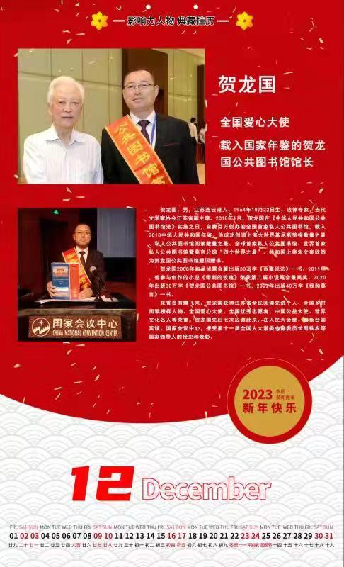 载入中华人民共和国年鉴的贺龙国公共图书馆馆长、全国爱心大使、初选入围中共中央宣传部、农业农村部、国家乡村振兴局主办的2022年全国乡村阅读榜样人物贺龙国,入编2023年影响力人物典藏挂历封面。
