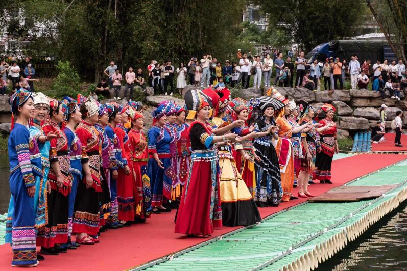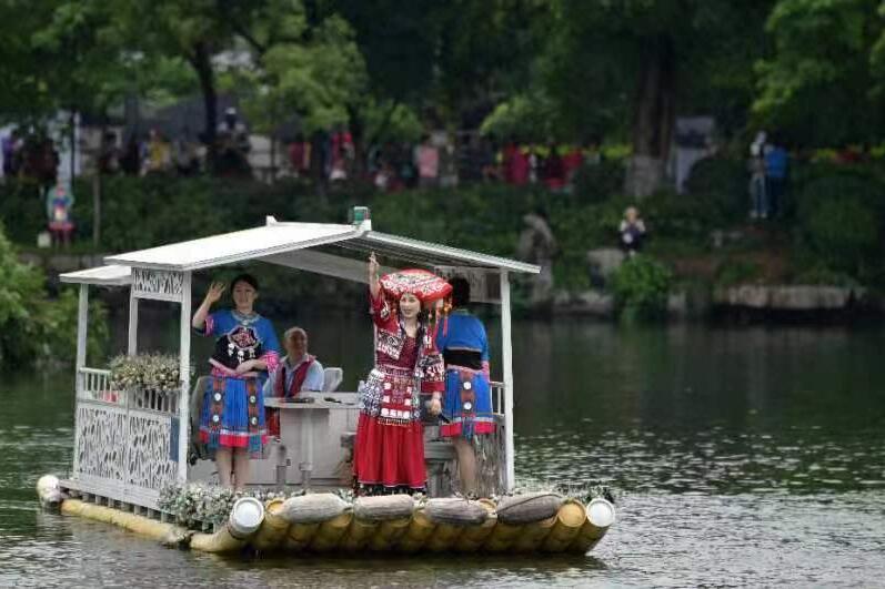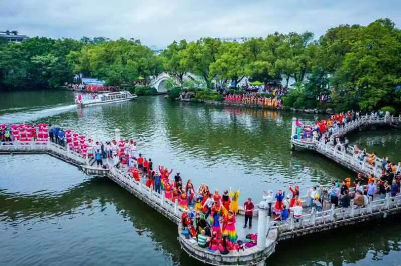 今天的活动在热烈的民族歌舞《广西尼的呀》中拉开序幕。在两江四湖景区,展演了歌舞迎宾朋、嗨唱歌圩节、依依惜别情等三幕实景山歌会;在桂林漓江——阳朔精华段,邀请“刘三姐”传承人和相关嘉宾乘坐五星游船沿江而下,唱山歌与游客和民众互动,呈现了漓江岸上民众歌舞、渔翁撒网、中外游客互动等表演;在桂林市中心广场大舞台,开展了舞龙、舞狮表演,组织“潮聚三月三·和谐在八桂”——2023年桂林市民族团结进步宣传月暨第九届全国各民族优秀文艺节目邀请赛启动仪式,进行了精彩的节目表演,150人开场大合唱《广西尼的亚》,桂林市总工会职工艺术团 《中国梦里展未来》(桂林市创建民族团结进步示范市获奖歌曲)、贵州省贵阳南区文化馆红叶艺术团《盛世银装团圆鼓》、宁夏银川市君丽课堂百姓艺术团 《走咧走咧去宁夏》、新疆维吾尔自治区哈密金太阳紫韵艺术团《中华儿女一家亲》、桂林市祥云艺术团《唱起来、跳起来、苗家木鼓敲起来》、四川省成都市锦江区文化馆卓玛东方艺术团 《四川羌族服饰秀》、云南省昭通市百灵民族歌舞艺术团《幸福苗岭》、广西桂林市红绫飞舞艺术团 《盛世中华赞广西》等十个节目轮番上演,精彩的歌舞获得前来观看的全国各地游客的阵阵热烈掌声……