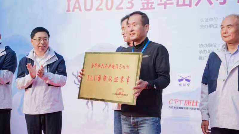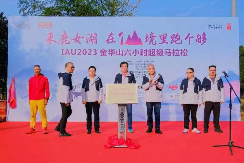 开幕式上,金华双龙风景旅游区党工委副书记、管委会主任徐赞致欢迎词,并与叶建国共同为金华山“浙江省体育旅游示范基地”揭牌;IAU 亚洲区主席朴吉洙为比赛授予国际超马赛事认证书;陈峰齐为七大洲南北极越野极限大满贯者、2023 年环法超级马拉松冠军梁新德颁发“金华山极限运动形象大使”证书。