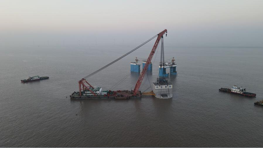 下午2点,距离大风到来还有15个小时,项目团队为所有参与沉桶作业的人员进行施工前的方案交底。下午4点,桶式基础结构沉放施工正式开始,半潜驳下潜、起重船辅助拖带桶体至沉放位置、排气下沉、排水负压下沉,一项项步骤井然有序,项目团队紧盯桶体倾斜的实时数据,每十分钟与起重船沟通及时调整桶体姿态,确保“大圆桶”平稳下沉。
