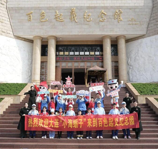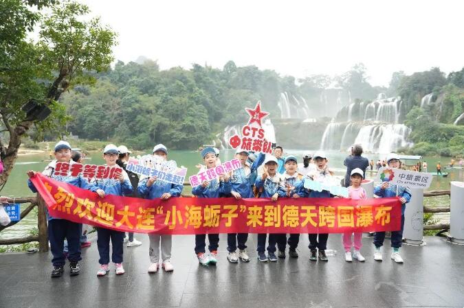 据悉,“小海蛎子”们跨越3200公里,前往中旅国际下辖百色起义纪念园、德天跨国瀑布景区开启研学旅行。在百色起义纪念园,大连“小海蛎子”与当地的“小砂糖橘”玩耍互动,观看百色起义电影、聆听红色故事、共唱国歌、手动拓印、品忆苦思甜红军餐,追寻红色记忆,重温峥嵘岁月,传承红色基因。在德天跨国瀑布,他们观赏了气势磅礴的亚洲第一大跨国瀑布,感受边关壮美的山水风景与独特的人文风情,并手持毛笔和红漆,认真描摹界碑的每一笔、每一划,表达对祖国的热爱。