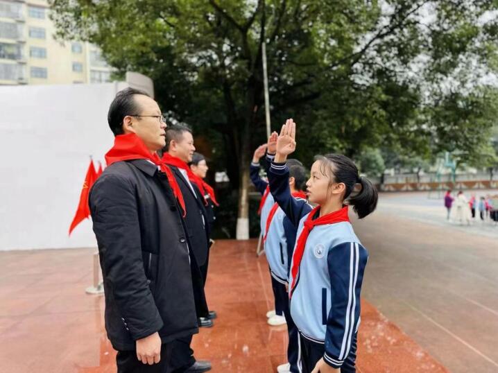 学校领导轮流在校门口值守,迎接师生安全入校。