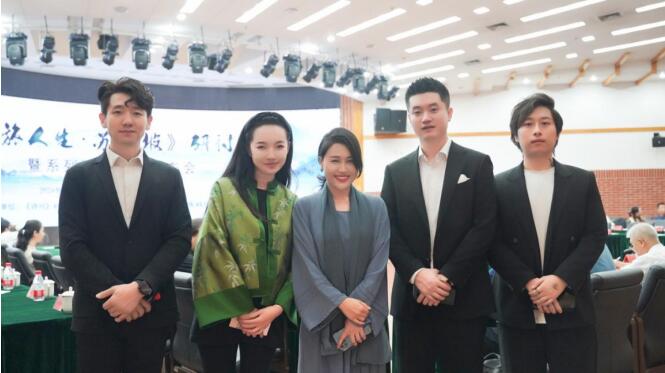 合影从左至右依次是:监制/苏东坡扮演者李仓卯 总制片人班班 青年歌唱家顾莉雅 出品人陈栋辉 演员秦浩