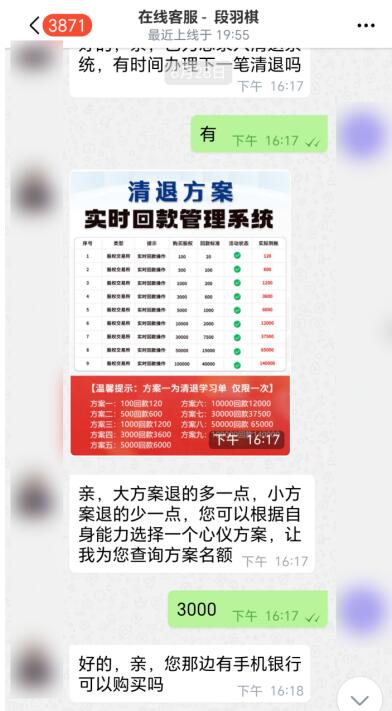 进行在线咨询时,一位自称是“刘老师”的人向林女士确认了培训机构的退费活动,并把退费流程和“财务小段”的联系方式发给了林女士。林女士按照流程点击“刘老师”提供的网址下载并注册了APP。“小段”让林女士选择一个退款方案再通过APP提交退费申请,并将“规划师”名片推给她。