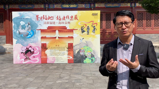 王铭教授主要从事中国中古礼制史的研究,特别是北魏皇帝庙号研究、唐宋丧葬仪制与信仰研究。他在《中国史研究》、《考古》、《中华文史论丛》等刊物上发表了20余篇论文,并主持了多个研究项目。此次参观福建非遗展,王铭教授表示不仅丰富了的学术视野,也为他的研究提供了新的灵感,他说到:“把泉州非遗带到北京中轴线上的景山公园,让我们看到非遗所代表的文化多样性在景山公园的一个体现,也是中华文化多样性的一个重要的体现;在展品上可以直观的看到既体现了泉州地区历史上在海洋上工作生活的劳动人民所衍生出来的生活方式,另外一方面呢,像瓷器和木雕这样一些体现在生活用具和建筑工艺上的非物质文化遗产,包括如今这些非遗之间发展出很多相互结合的地方以及和当今时代的一种结合,能够让北京的游客朋友看到很新奇很不一样的,带有海洋文化特色的非遗作品,开阔了我们的视野;在历史文脉上来讲也有关联,景山公园所在地是元大都中轴线上重要的点,是元朝的皇宫所在的位置,那个时代也是北京成为全国文化中心的开始,以及全国政治中心的开始,也是全国国际交往中心的开始 ,当年和世界有很多的交流,很多来自欧洲的旅行家,商人使节来到元大都,就是今天的北京这座城市,比如著名的马可波罗就是从丝绸之路到的元大都见的元世祖忽必烈,然后又沿着大运河南下到了扬州、杭州,又进一步到了泉州,回国的时候就在泉州沿着海上丝绸之路护送元朝的阔阔真公主到伊利汗国去出嫁,完成任务之后他又回到了他的故乡意大利威尼斯,我们可以看到海上丝绸之路通过大运河能够连接我们的北京在元明清时期的首都,所以北京中轴线上景山公园这样一项世界遗产点,其实是站在中国的首都联系世界,通过运河,通过海丝联系世界的这样一个视角 ,把中国和世界的关联,通过海丝城市泉州这样一座世界遗产之城和北京中轴线上的景山公园的这样一次对话,让大家能够理解这次展会所蕴含的深层的意义,中国新晋的北京中轴线中国理想都城的秩序杰作,这样一项世界遗产他申遗成功的重要意义所在”。