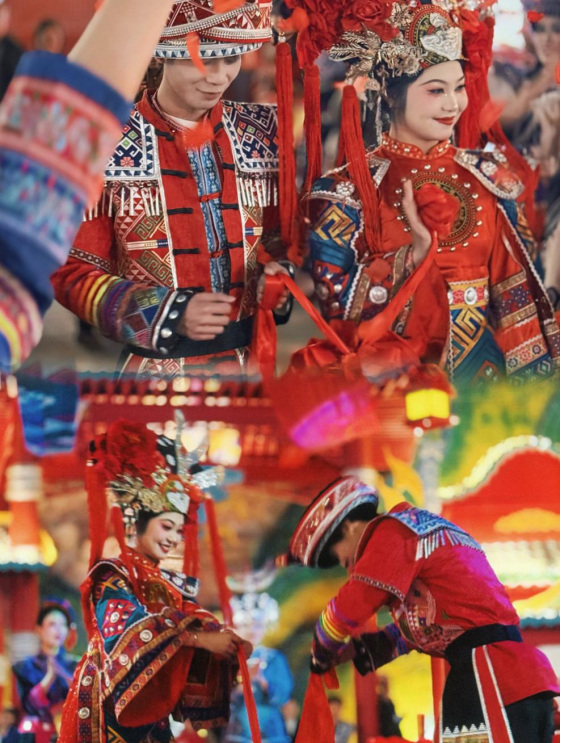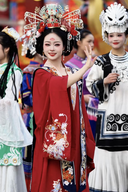 (壮族、瑶族、苗族、侗族、仫佬族、毛南族、回族、京族、彝族、水族、仡佬族共11个世居少数民族,加汉族,一共12个民族身穿各自少数民族服饰,迎接游客到来。)