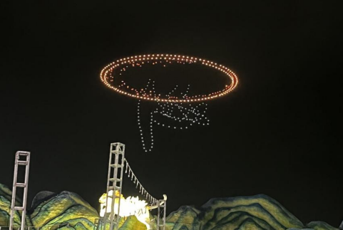 无人机表演天空之门,多个图案轮换,感受现代科技的魅力,仿佛画卷在夜空中缓缓展开。