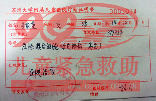 孩子于今年7月份在苏州大学儿童医院检查确诊为急性混合细胞白血病。后经医生检查后制定了治疗方案,先做5次的基本化疗,在做骨髓移植,预计费用达100万元左右。后家人通过亲朋好友及当地政府的援助给孩子做了化疗,目前孩子正在第5次化疗中。化疗结束后就可以给孩子做骨髓移植了,但是由于移植费用还需40-50万元左右,家中实在拿不出费用了,所以配型好后也暂时做不了移植。