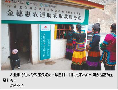 截至2017年6月底,农业银行在832个国家扶贫开发工作重点县已发放惠农卡5505万张,布放各类电子机具21.1万台,设立金穗惠农通服务点14.6万个,行政村覆盖率达72.1%。具备固话通信网络条件的行政村已基本实现全覆盖,为贫困地区群众提供便捷的小额存取、转账、结算等基础金融服务。