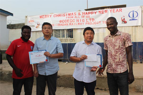 人民日报欧洲网尼日利亚奥贡州讯 当地时间12月22日17时整,位于尼日利亚奥贡州奥代打镇的中铁十一局二公司拉伊铁路项目部在项目营地为当地雇员举办了迎新颁奖活动。公司副巡视员王超,项目经理石强出席活动,中方职工和当地雇员80余人参加了此次活动。