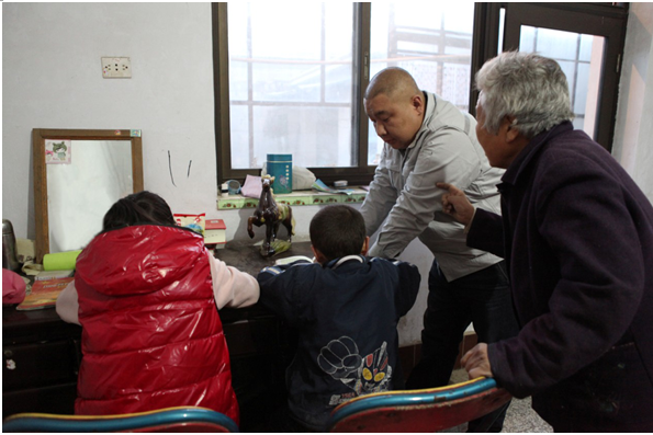 (图为侯建良在指导两个孩子写作业,关心他们的学习情况)