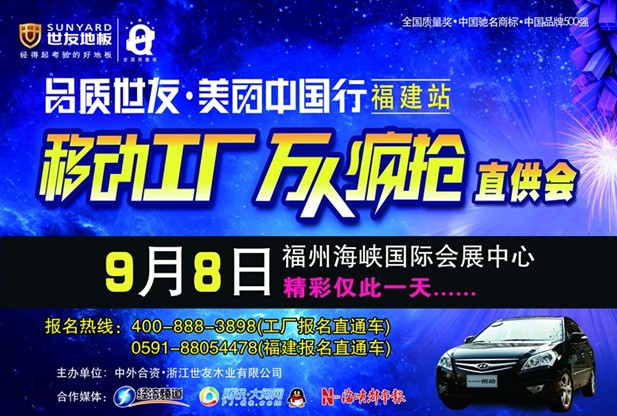 世友地板“移动工厂、万人疯抢”特大型万人工厂直供会活动福建站将于9月8日于福州海峡国际会展中心举行。