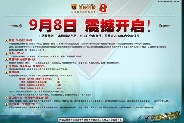 据悉,此次活动,世友地板总裁将携手福建经济生活频道《热线777》栏目一起,全程保价,除了直接给消费者让利的措施,还有间接的让利手法。每个新装修业主必备的液晶电视轮番抽奖,更是将消费者参与活动的热情进一步高涨。 “不把消费者当上帝,把消费者当衣食父母,才能切实的尊重顾客!增加活动附加值,让顾客高高兴兴来、快快乐乐回才是这次活动要达到的终极目的”。
