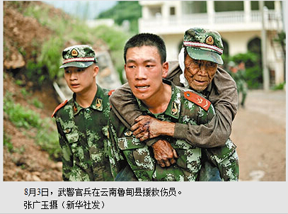 8月3日,武警云南总队官兵在昭通市鲁甸县展开救援。