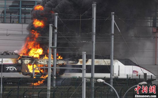 当地时间5月30日,法国圣丹尼,一列巴黎至里昂的高速火车发生火灾。图片来源:CFP视觉中国
