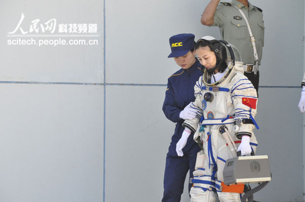 女航天员王亚平第一个步出问天阁。(人民网记者 魏艳摄)