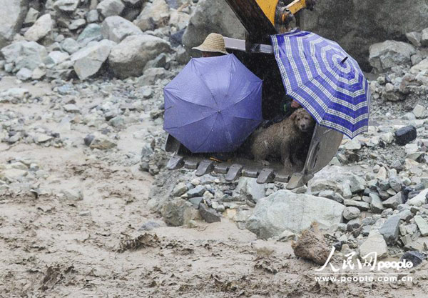 因为泥石流不断倾泻,断路处被巨石和淤泥堆成了一个45度的乱石坡,随时可能垮塌。挖掘机要先爬坡才能到达接人的地点,每隔几分钟,几十吨重的巨石就会与洪水一同倾泻而下。