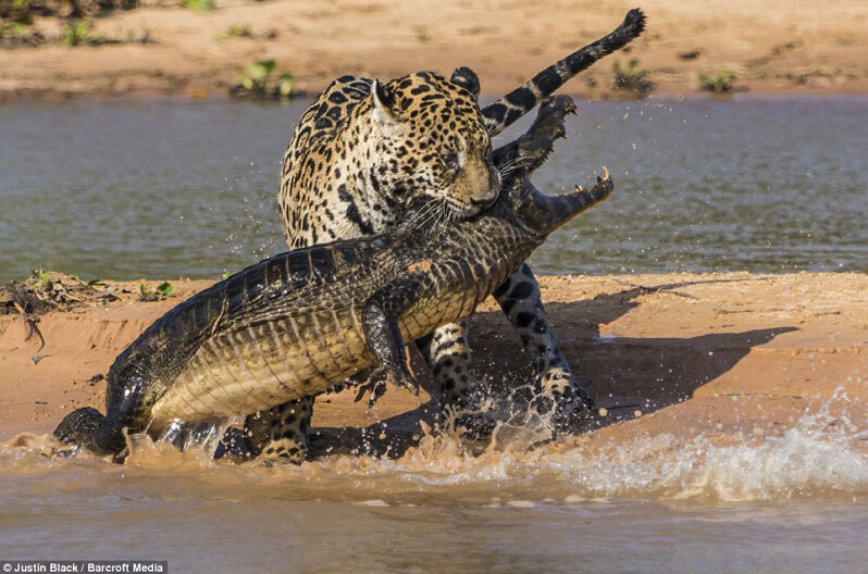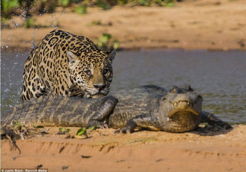人民网芝加哥7月2日电 美国摄影师 Justin Black在巴西拍到美洲虎涉水猎杀鳄鱼的精彩场面。事发当天,一条约120多斤重的鳄鱼在沙丘上晒太阳,丝毫没注意到一头美洲虎悄无声息地游过河爬上了自己所在沙丘。