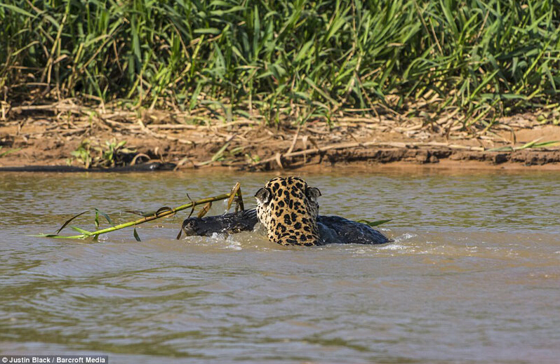 紧接着,美洲虎跃出水面,用爪子按住鳄鱼身体,同时狠狠咬住对手的后背。遭受突袭的鳄鱼虽然拼命挣扎,但无济于事,很快就被被美洲虎轻松叼起来拖入水中带到河的另一侧登陆,估计早成了美洲虎的一顿美餐。