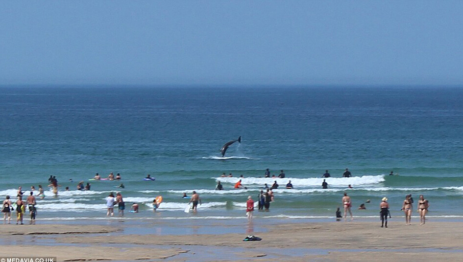 日前,一只野生海豚出现在英国康沃尔海滩并跃出水面,惊奇兴奋的游客欣赏到这场“表演”并拍下这一幕。后为确保海豚安全,在救生员与一架直升飞机的帮助下,海豚游离了海岸。