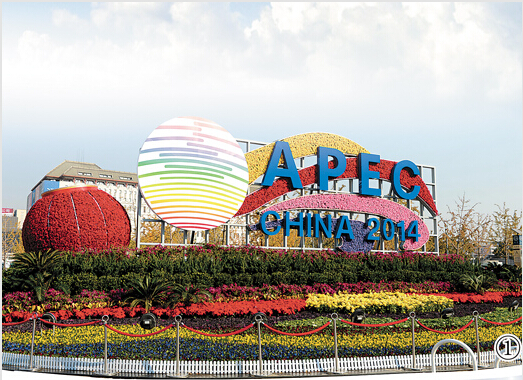 图①:11月4日,位于北京西单的花坛营造出APEC氛围。