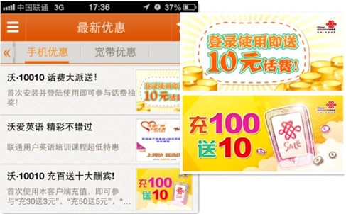 图1. “沃•10010掌上服务”优惠信息展示