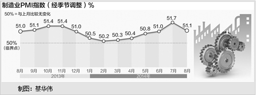 蔡进认为,在经济新常态下,部分指标出现波动是正常的,PMI月度之间出现波动属于正常现象。PMI是一个反映经济趋势变化的景气指数,一般情况下,连续3个月以上的同向变化才能基本确立经济走向。蔡进说,从今年的情况看,6月、7月、8月连续三个月的PMI指数均位于51%以上,说明我国制造业整体上处于合理区间。