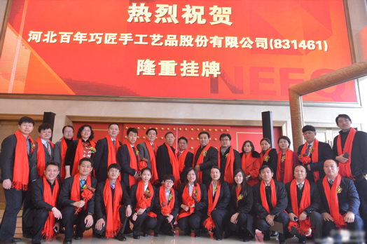 2015年1月29日,河北百年巧匠手工艺品股份有限公司(以下简称“百年巧匠”)的6名普通员工,在北京全国中小企业股份转让系统大厅内,敲响了百年巧匠公司的上市钟声。标志着“百年巧匠”成为河北省首家在新三板上市的文化创意企业。
