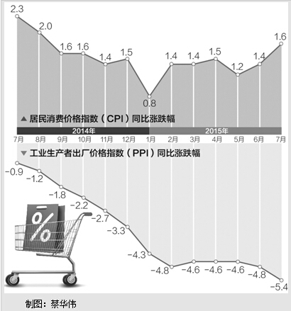 本报北京8月9日电 (记者朱剑红)国家统计局今天发布的数据显示,7月份全国居民消费价格指数(CPI)环比上涨0.3%,同比上涨1.6%,涨幅创下今年以来新高;工业生产者出厂价格指数(PPI)环比下降0.7%,同比下降5.4%。据测算,在7月份1.6%的CPI同比涨幅中,去年价格上涨的翘尾因素约为0.8个百分点,新涨价因素约为0.8个百分点。社会各方关心的猪肉价格上涨对CPI的影响情况是:影响环比上涨约0.30个百分点,影响同比上涨0.48个百分点。