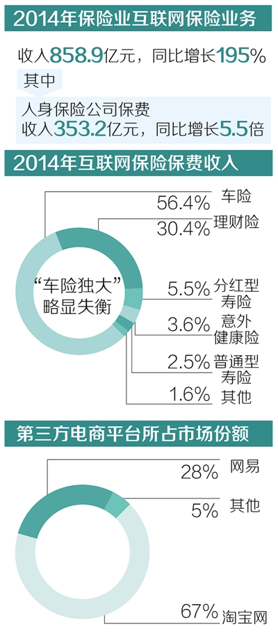 统计显示,2014年产险公司的互联网保险收入90%来自公司自有官网,而人身险公司仅有5%的保费收入来自官网,95%来自第三方销售平台。在第三方平台中,淘宝网所占市场份额由2012年的99%下降至67%,占比仍为最高;网易占28%,位居第二。