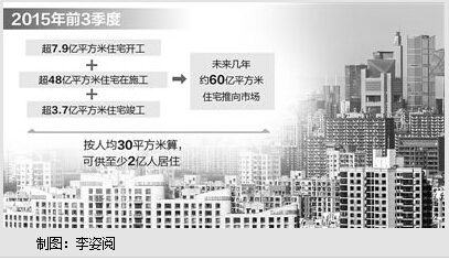从供给端看,中国住房供给进入集中爆发期。住房从规划建设到形成供给,需要一定周期。2008年以来住房市场持续高烧,导致过去几年开发商快速扩张,并在近两年集中推向市场。国家统计局数据显示,前三季全国还有逾7.9亿平方米的住宅新开工,超过48亿平方米的住宅在施工,3.7亿平方米的住宅竣工,即便不将在售待售住宅面积计入,也意味着未来几年将有约60亿平方米的住宅推向市场。如果按我国人均住房面积30平方米计算,这些待售住房至少还可供2亿人居住。